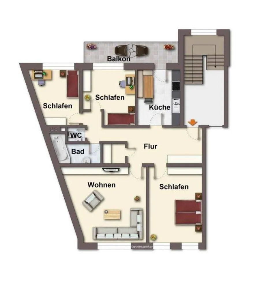 Wohnzimmer, 3 Schlafzimmer, Küche, Bad, WC, Abstellraum, Balkon