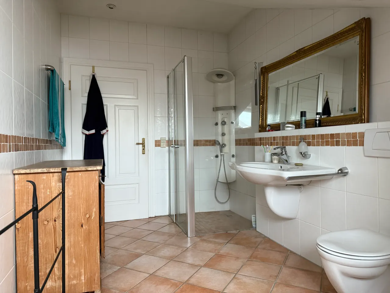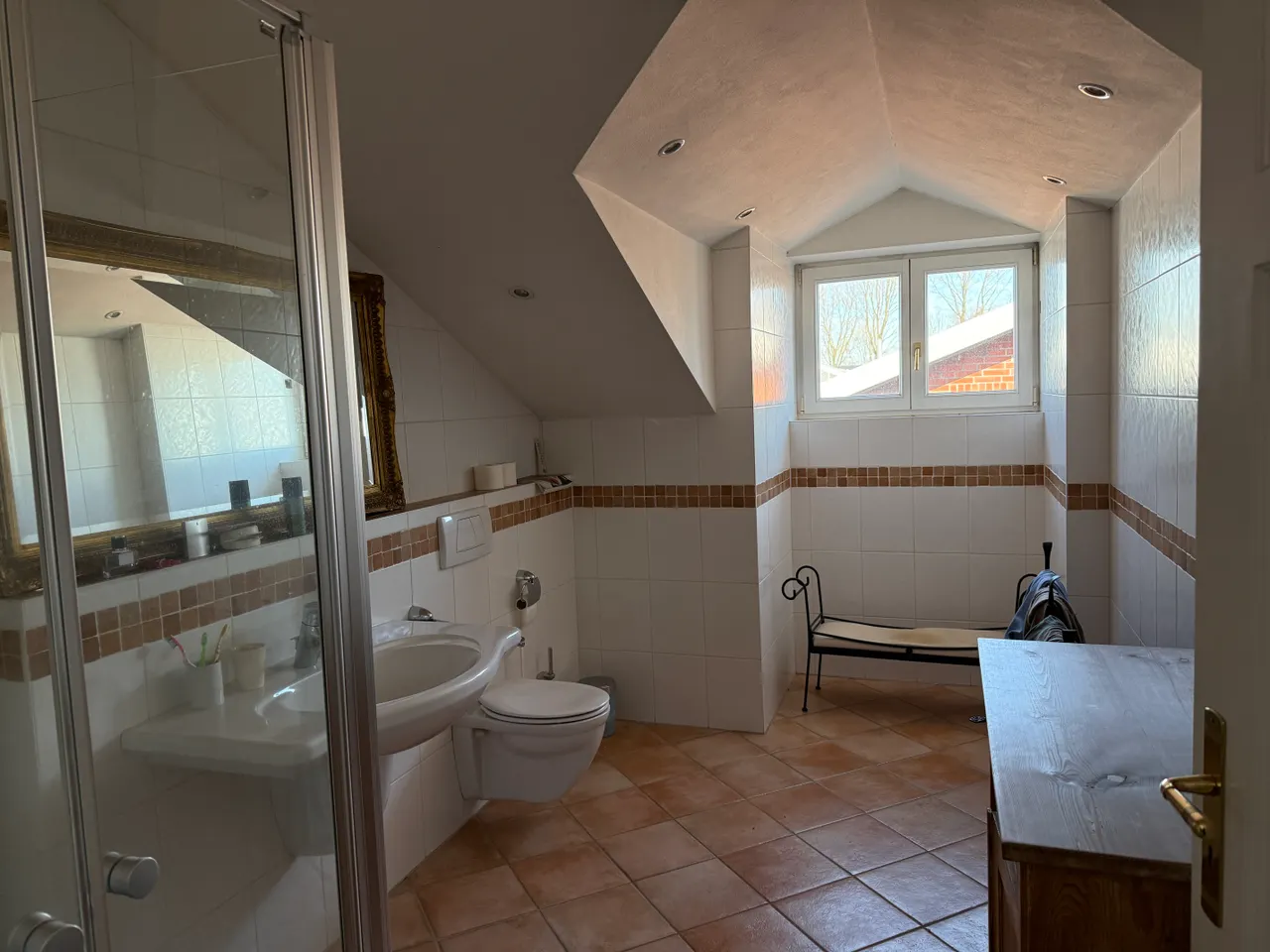 Dieses Wohnhaus am Deich im Landhausstil (Baujahr 2001) bietet auf einer Wohnfläche von ca. 440 m² großzügigen Wohnkomfort. Die Raumhöhen von 2,85 m im EG geben dem Haus ein herrschaftliches Ambiente, wie es unter anderem in Gulfhäusern anzutreffen ist. Das Anwesen verfügt über insgesamt 10 Zimmer, darunter 5 Schlafzimmer und 2 Badezimmer. Die offene Wohnküche verfügt zum einen über einen direkten Essbereich im Küchenraum, zu anderen befindet sich im angrenzenden Raum ein klassischer, gemütlicher Essraum. Dieser Raum ist mit einem Kachelofen ausgestattet und fungiert als Bindeglied zwischen Küche, Wohnzimmer und Wintergarten. Die großen Fensterflächen sorgen für lichtdurchflutete Räume. Das Wohnzimmer mit Kamin und Blick in den Garten schafft eine weitere angenehme, einzigartige Wohnatmosphäre. Außerdem sind Abstellräume, ein Hauswirtschaftsraum und ein Kühlraum vorhanden. Im Obergeschoss befinden sich 5 Schlafzimmer, zwei Bäder und ein Hauswirtschaftsraum. Ein Schlafzimmer verfügt über eine große Dachterrasse, ein anders über einen Balkon.