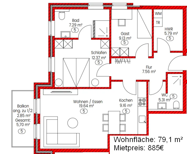 Die Wohnung bietet eine durchdachte Raumaufteilung mit einem großzügigen und lichtdurchfluteten Wohn-/Essbereich samt offener Küche. Vom Wohnbereich aus gelangt man auf den überdachten Balkon, der somit ganzjährig nutzbar ist.