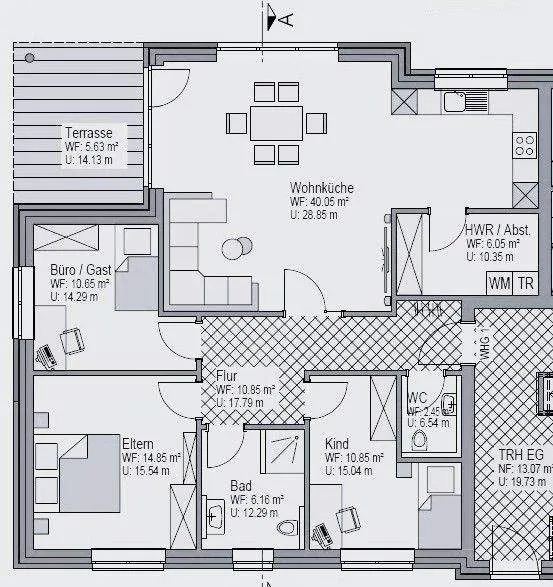 Wohn-/Esszimmer mit Kochbereich und Einbauküche, 3 Schlafzimmer, Bad/WC, Gäste-WC, Hauswirtschaftsraum/Abstellraum, Flur, Terrasse