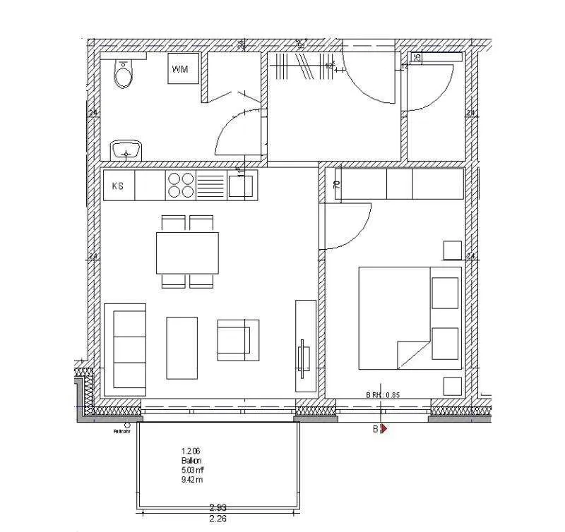 Wohn-/Esszimmer, Schlafzimmer, Bad/WC, Abstellraum, Flur, Terrasse, ca. 48 m² Wohnfläche